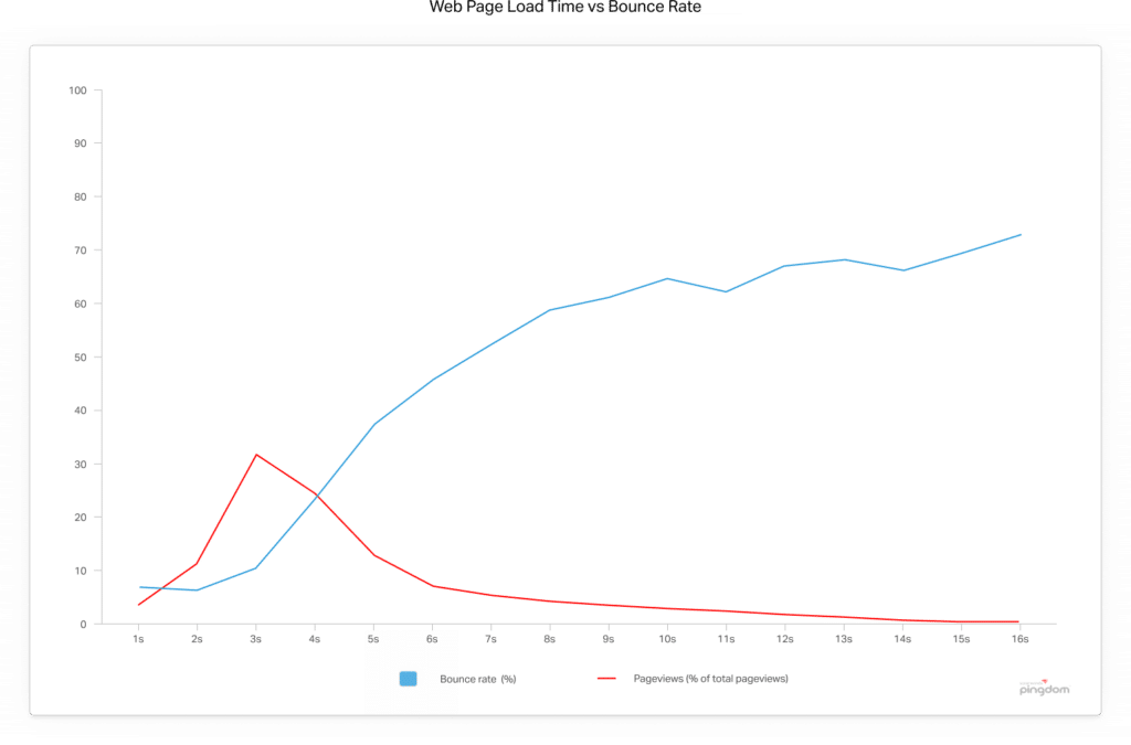 Kuten yllä olevasta kuvaajasta nähdään, sivujen, jotka latautuvat kahdessa sekunnissa, keskimääräinen välitön poistumisprosentti on 9 %. Heti kun sivun latausaika ylittää kolme sekuntia, välitön poistumisprosentti nousee huimasti, ollen jo 38 % viiden sekunnin kohdalla! Lähde: pingdom.com